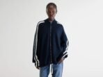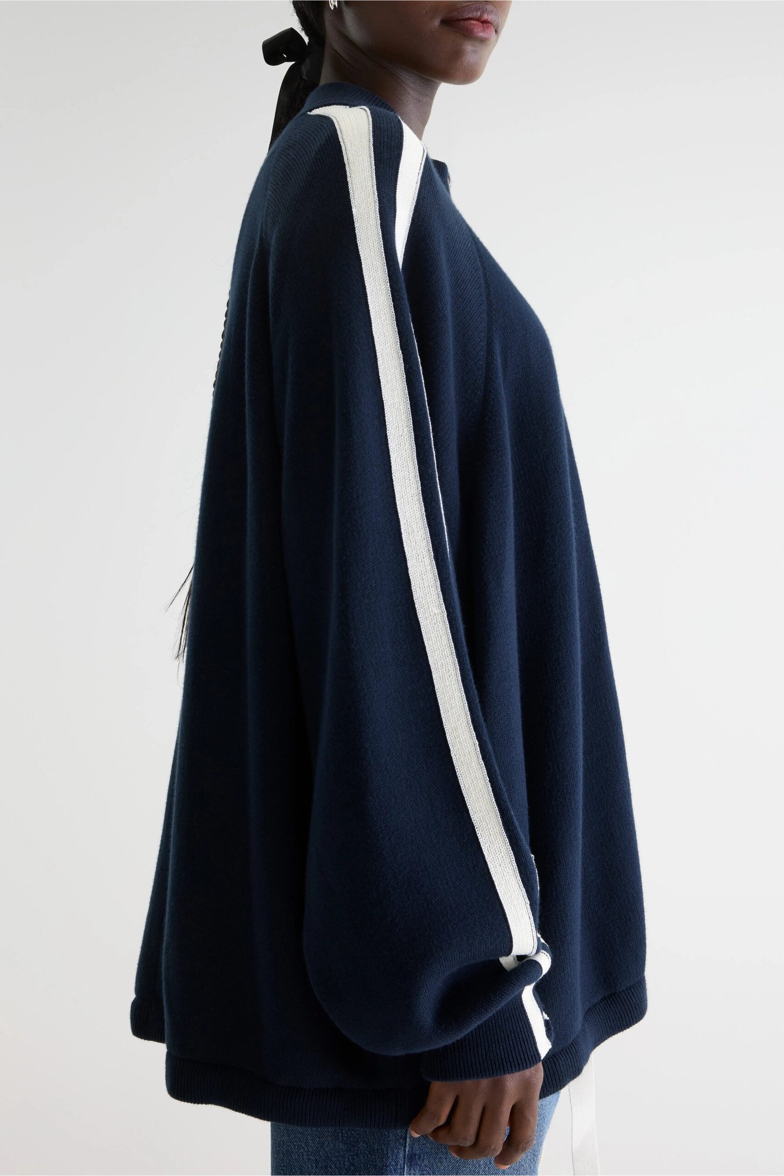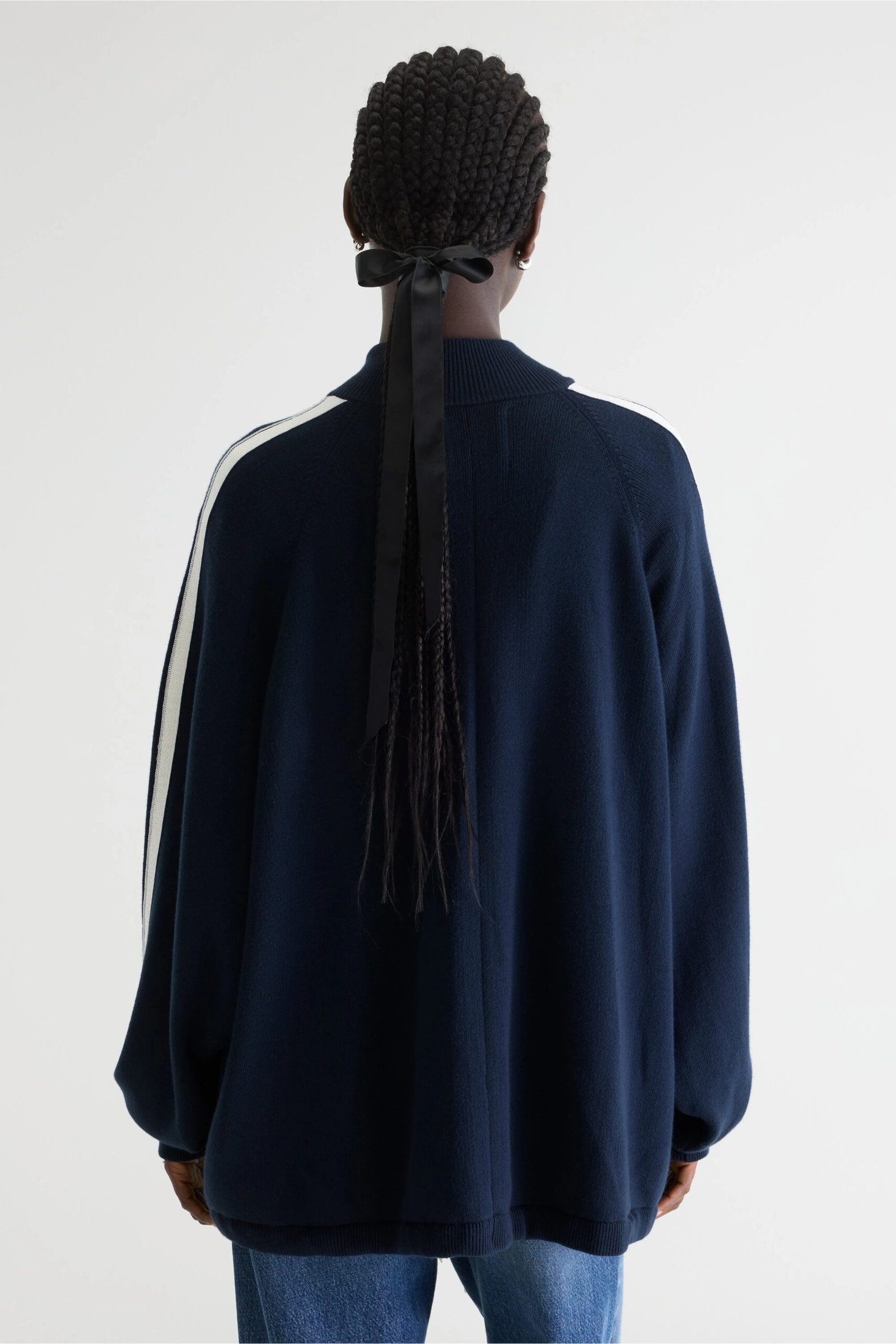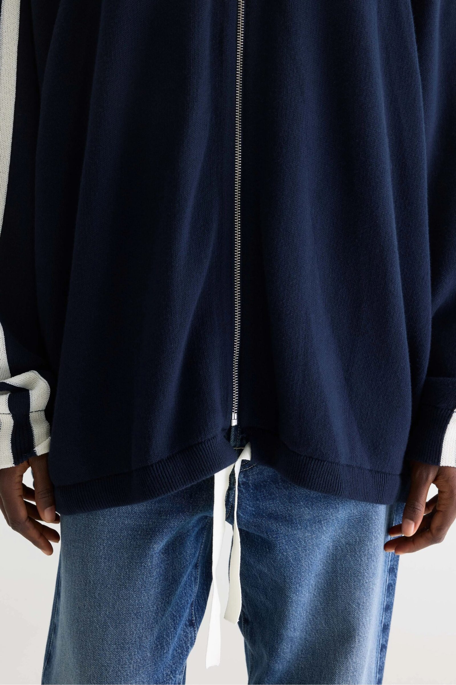 Oversized zipped cardigan in navy blue featuring a high ribbed collar. contrast stripe details on the sleeves. and a full-length silver zipper. The drawstring hem with ribbon ties adds an adjustable fit.