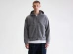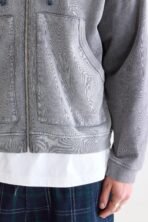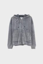 Relaxed zip-front hoodie with ribbed trims. dropped shoulders and patched pockets. made from black-blue cotton fleece with distressed details and heavy fade out.