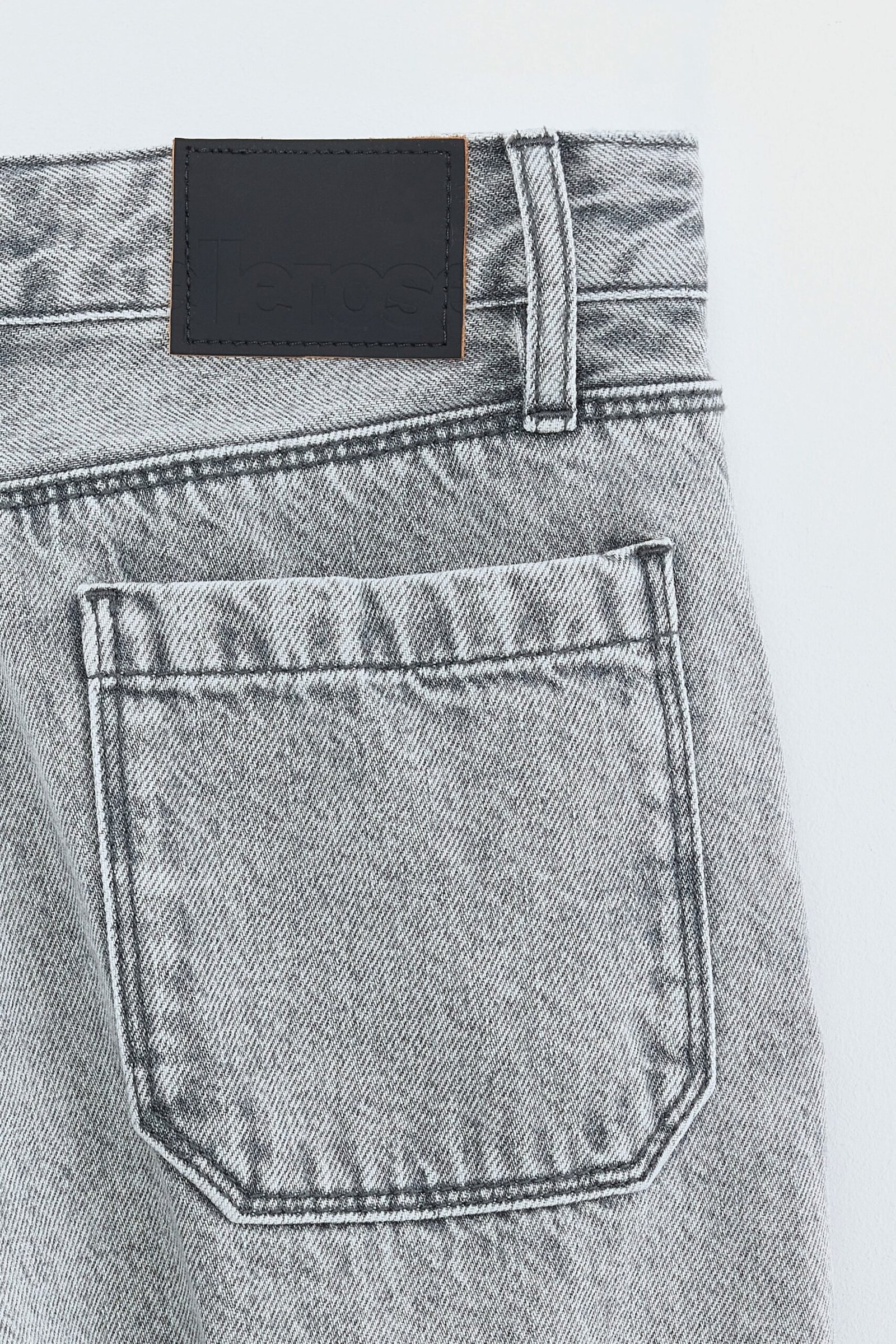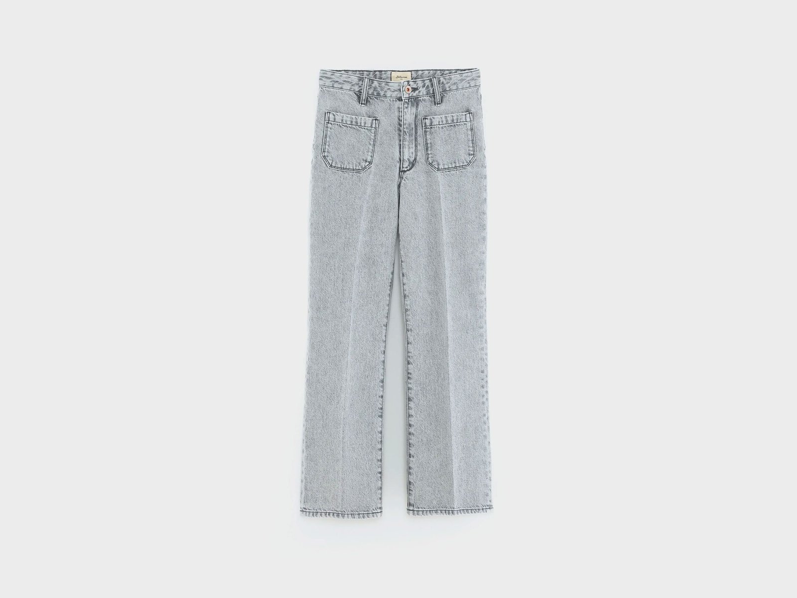 Regular flared jeans with patched front and back pockets. in light used grey cotton denim.